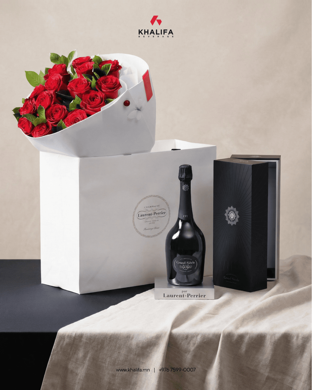 Laurent-Perrier оргилуун дарсыг Lumi цэцгийн дэлгүүрийн улаан сарнайн баглаатай хослуулсан бэлгийн багц